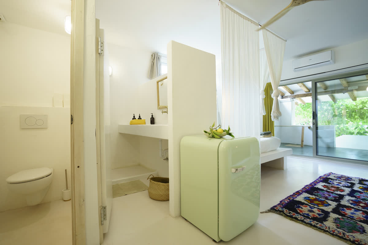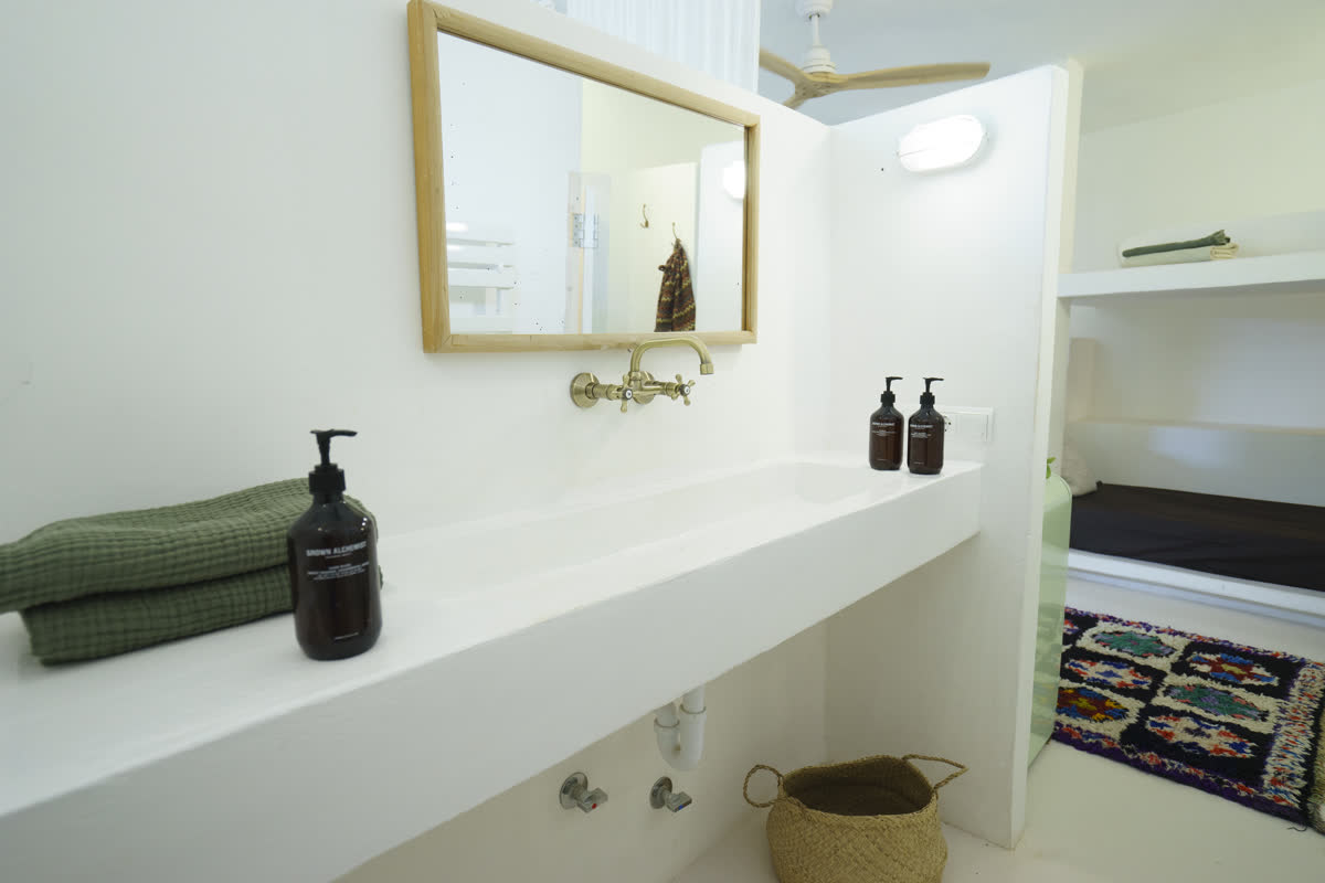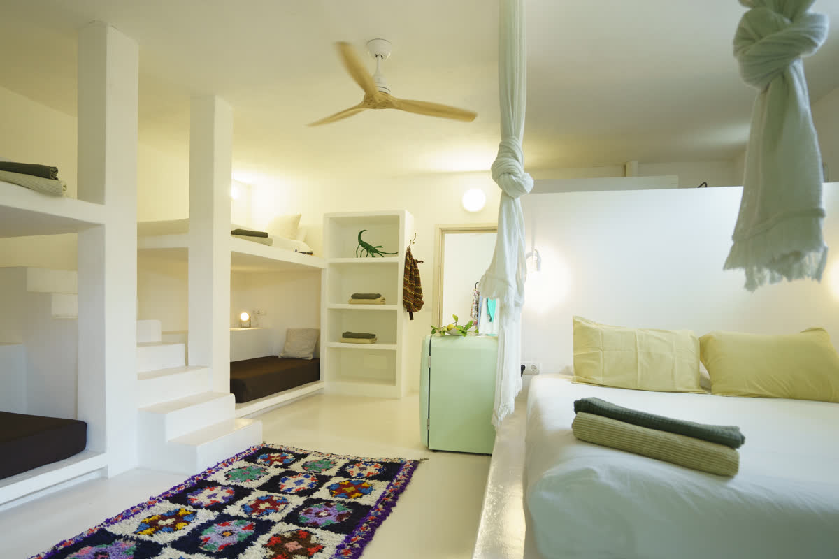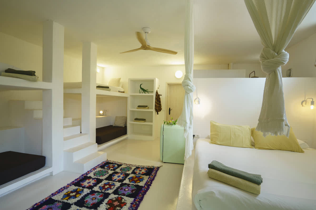 Eine Casita für eine Familie, drei Paare oder Freunde. Es hat drei Doppelbetten wie casita #3, aber es ist größer. Beim Betreten gibt es zwei Doppelbetten auf zwei Ebenen, ein Kingsize-Bett in einem separaten Raum, der mit einer Tür geschlossen ist, und eine Bank zum Entspannen oder Arbeiten.